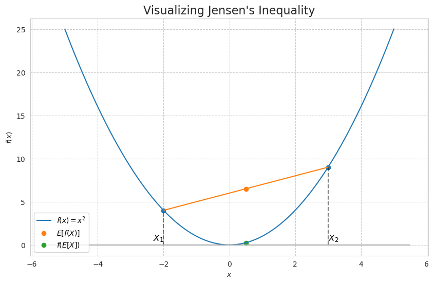 \[E[f(X)] >= f(E[X])\]Here, $E[X]$ is the expected value or mean of the random variable $X$.