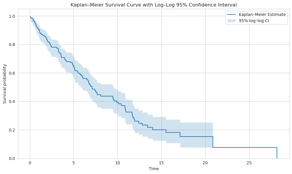 \[\text{Lower CI} = \exp\left[-\exp\left(\ln(-\ln \hat S(t)) + z \cdot \frac{\sqrt{V(t)}}{|\ln \hat S(t)|}\right)\right]\] \[\text{Upper CI} = \exp\left[-\exp\left(\ln(-\ln \hat S(t)) - z \cdot \frac{\sqrt{V(t)}}{|\ln \hat S(t)|}\right)\right]\]Practical Notes and Edge Cases