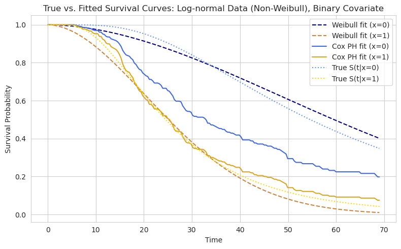 As can be seen from the example plot above, Weibull fit, unlike Cox PH, produces a smooth curve. Even though the fitted distribution is not the same as the one which generates the data, it can still be closer to it because the parameters are considering the change in time.